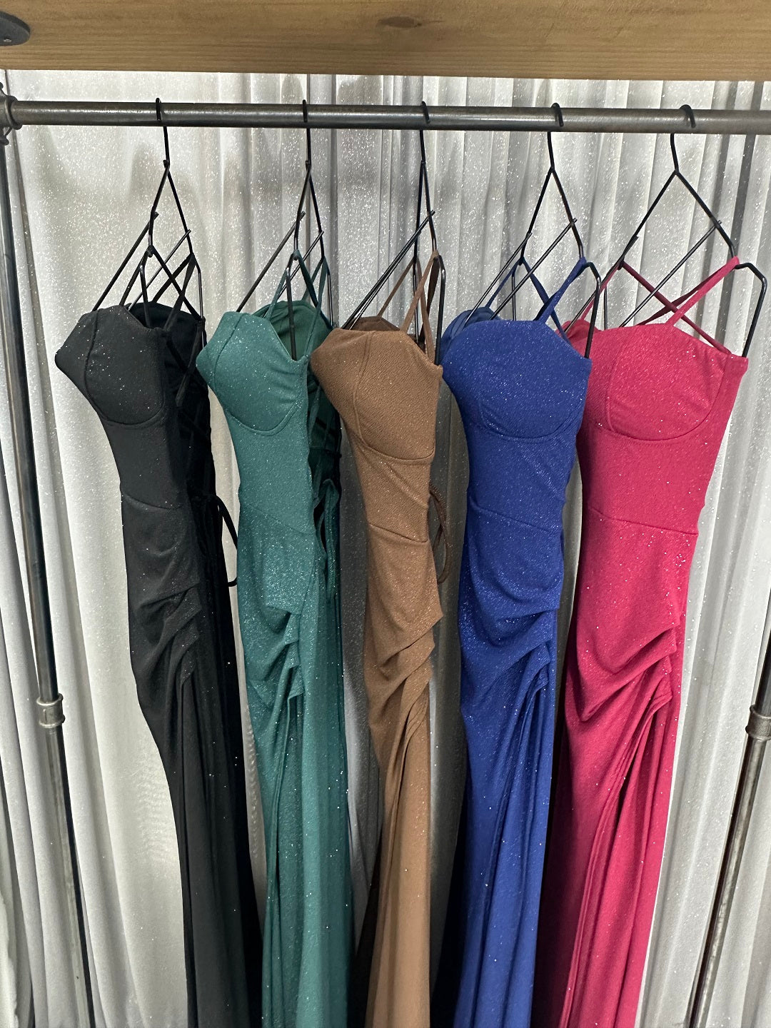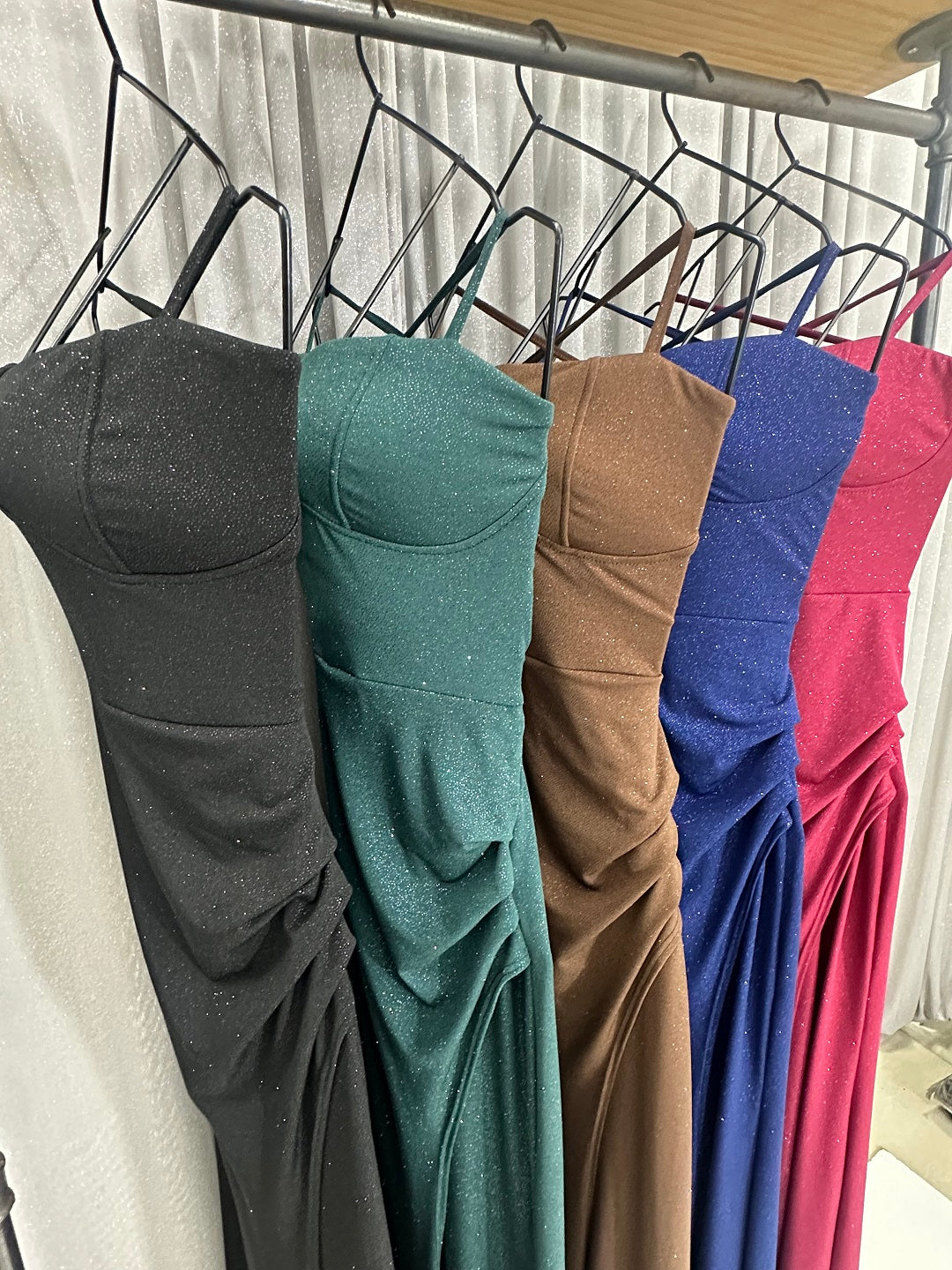 Este vestido largo combina elegancia y sensualidad con un diseño minimalista pero impactante. Su escote en forma de corazón, realzado por delicados tirantes finos, aporta un toque romántico y sofisticado. La tela brillante crea un efecto sutil de luminosidad, ideal para destacar en cualquier ocasión especial. Ajustado en la parte superior, el diseño se entalla a la cintura y fluye con una falda larga que se abre en una abertura lateral, aportando dinamismo y un aire seductor. La modelo esta usando Talle 1.