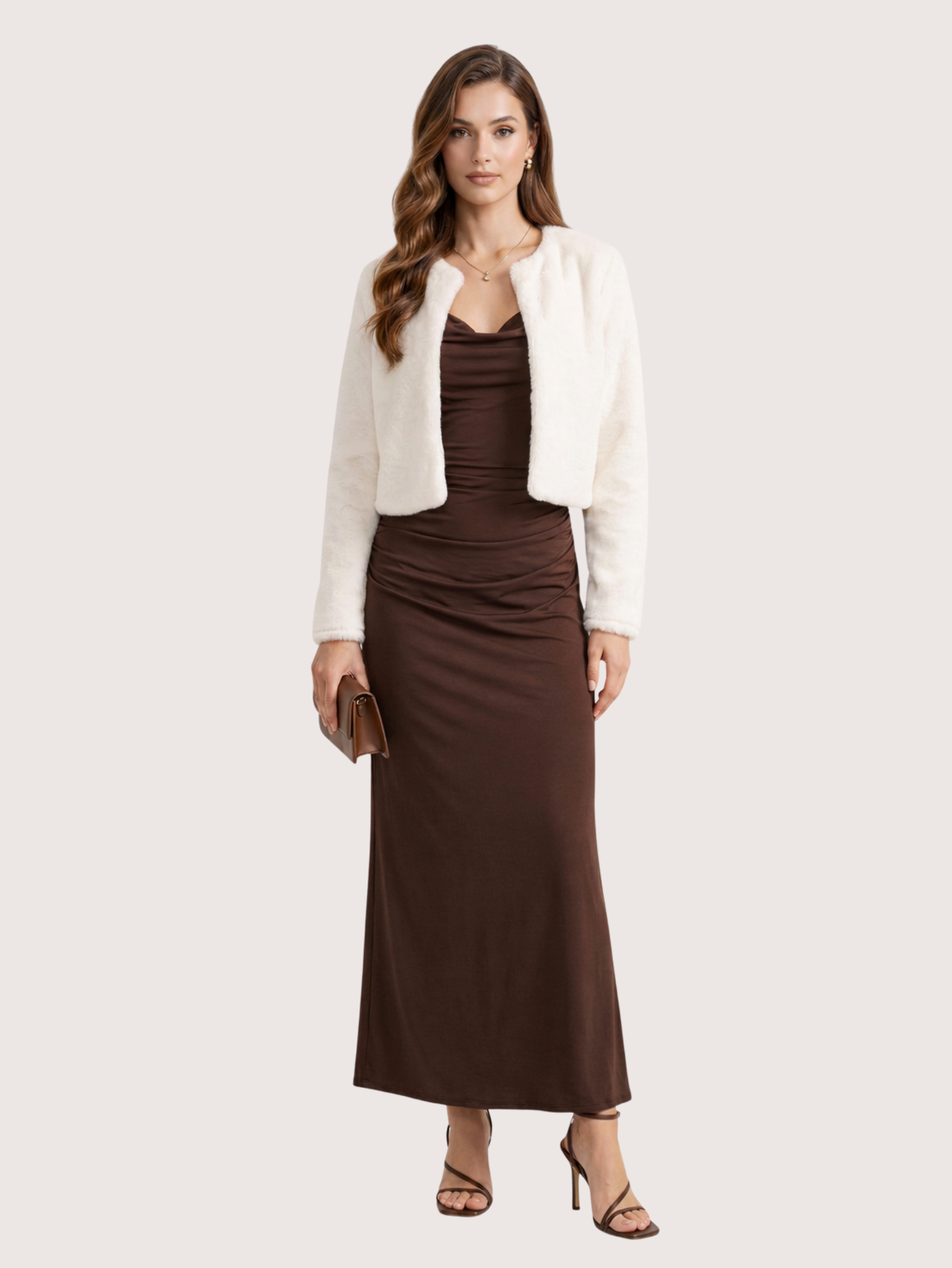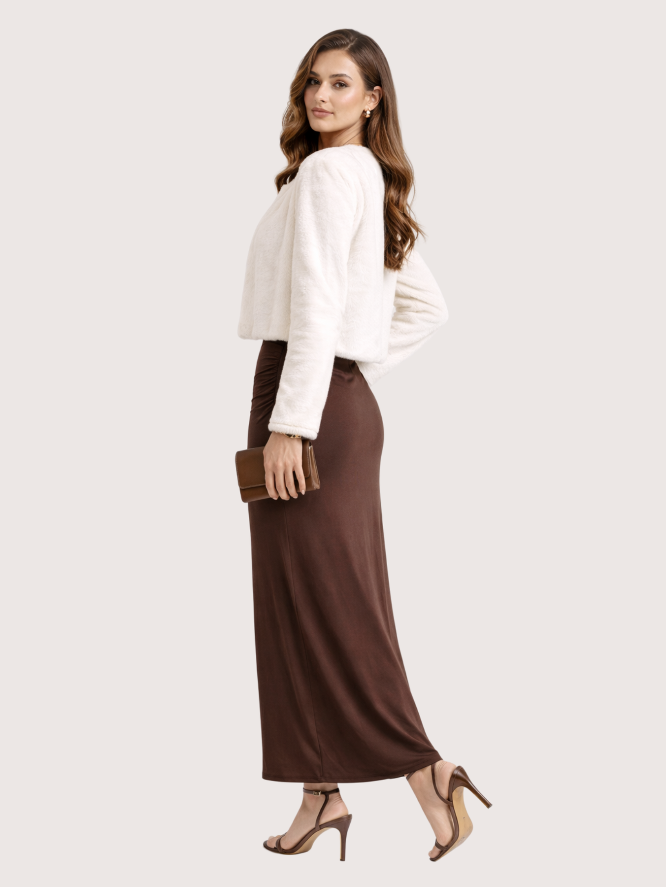 Este saco corto de textura aterciopelada es una prenda de diseño minimalista, sin botones ni cierres visibles, para un aspecto limpio y moderno, ideal para combinar con todo tipo de prendas. Con mangas largas ajustadas y un corte recto abierto, brinda un ajuste cómodo y versátil. La tela brinda calidez, perfecto para ocasiones especiales o eventos nocturnos. Su estilo refinado permite llevarlo con vestidos de fiesta, faldas o incluso looks más casuales. La modelo esta usando Talle 1.