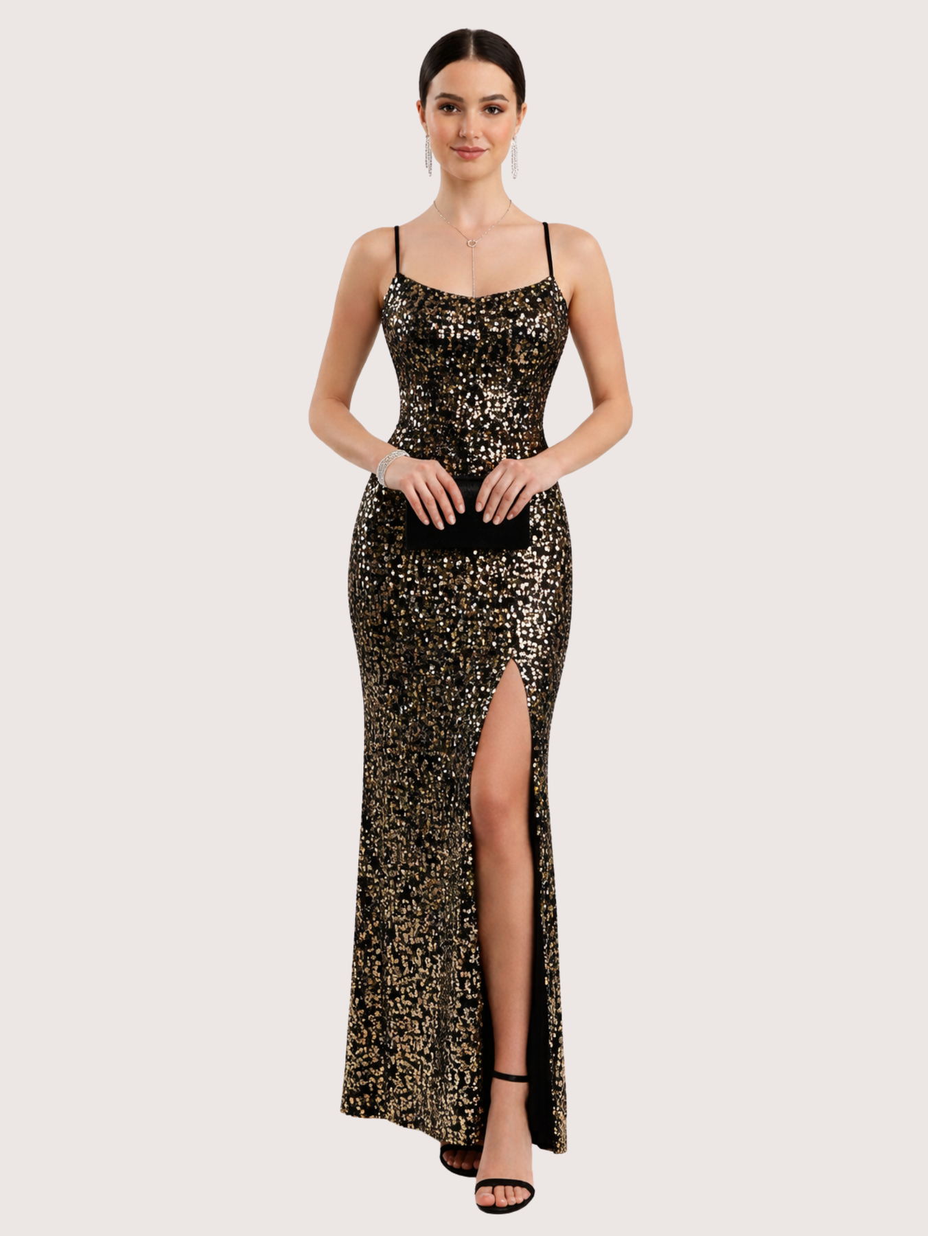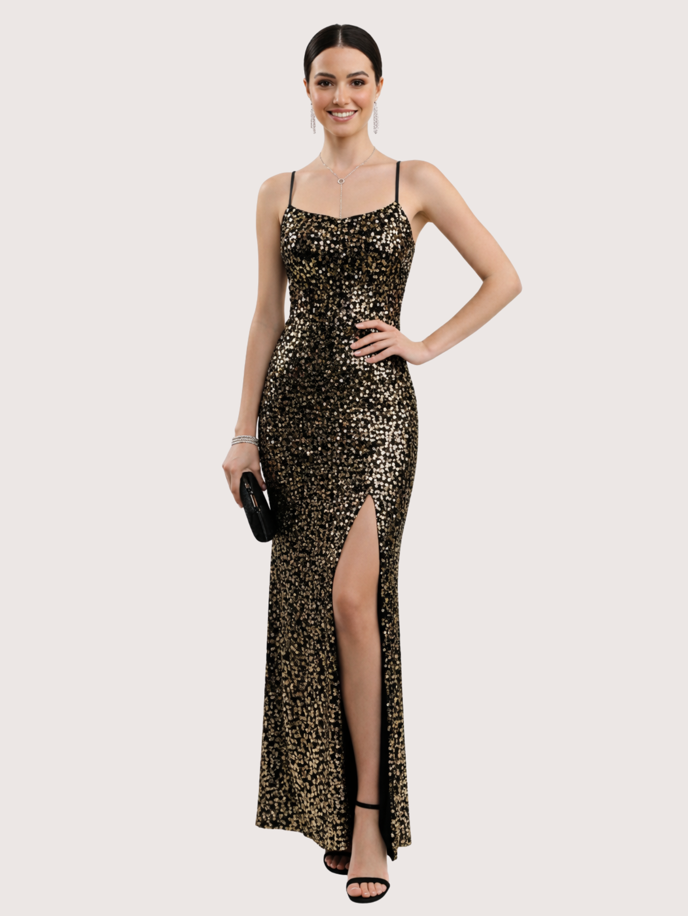 Este deslumbrante vestido de noche destaca por su elegancia y brillo de lentejuelas. El corte sirena con abertura lateral resalta la figura, mientras que el escote de tirantes finos añade un toque de sofisticación. Perfecto para cualquier evento formal, este diseño te asegura ser el centro de todas las miradas. La modelo esta usando Talle 1.