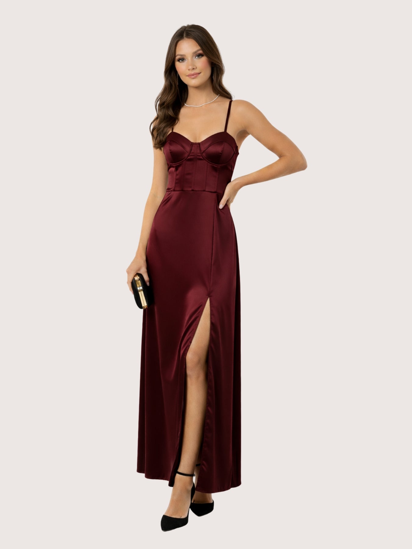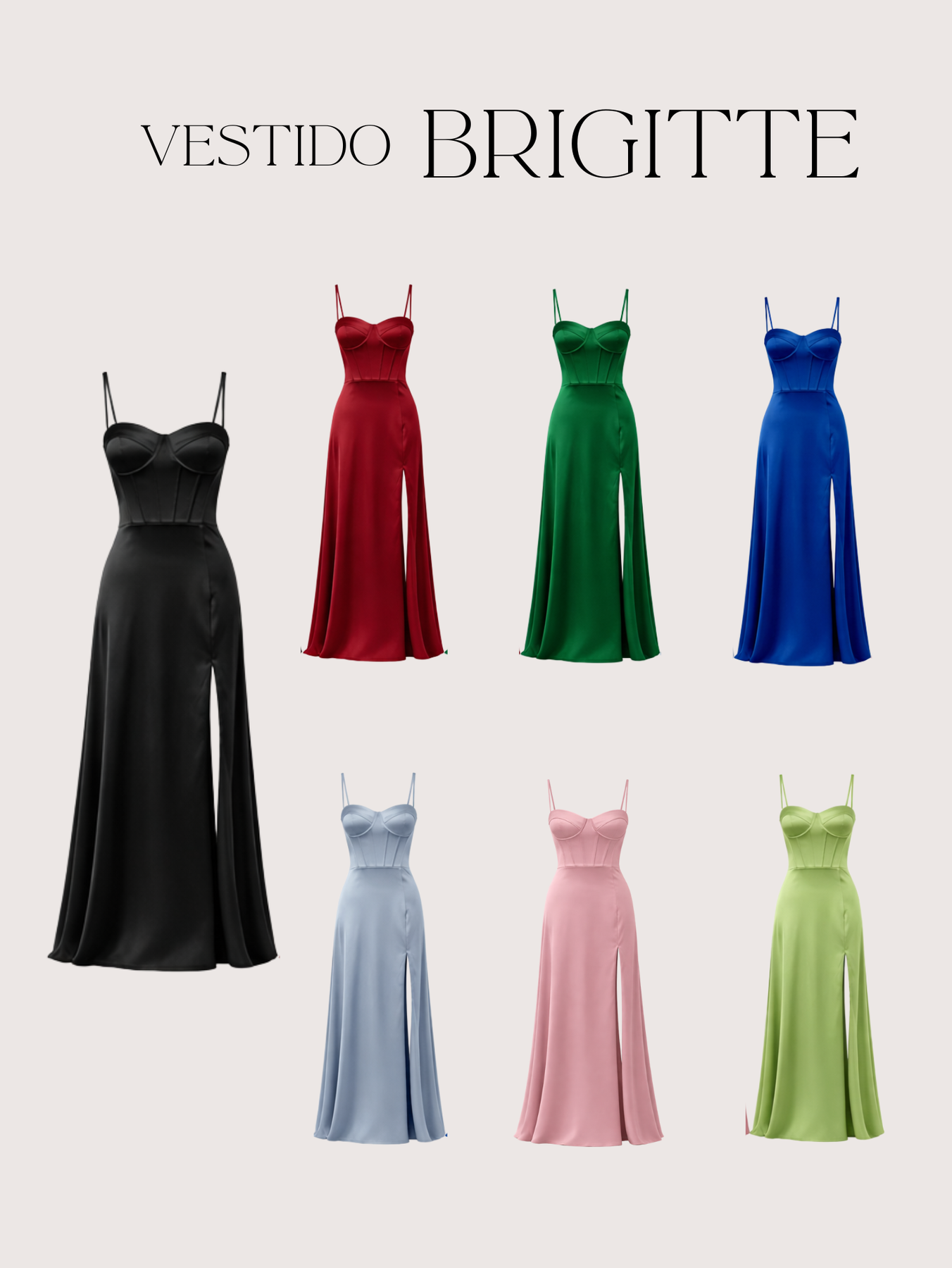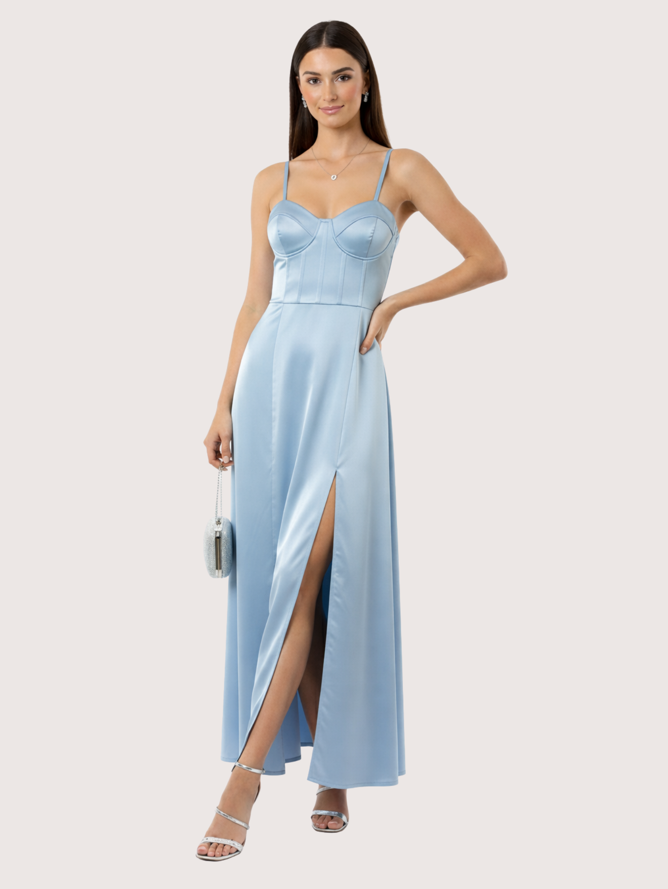 Vestido largo confeccionado en un tejido satinado que aporta un brillo delicado. El vestido presenta en la parte de arriba un estilo corset con escote y la parte de la pollera tiene un tajo o abertura para dar aire y sensualidad. Perfecto para galas, eventos formales o celebraciones especiales, este vestido te hará destacar con un estilo refinado y atemporal. La modelo esta usando Talle 1.