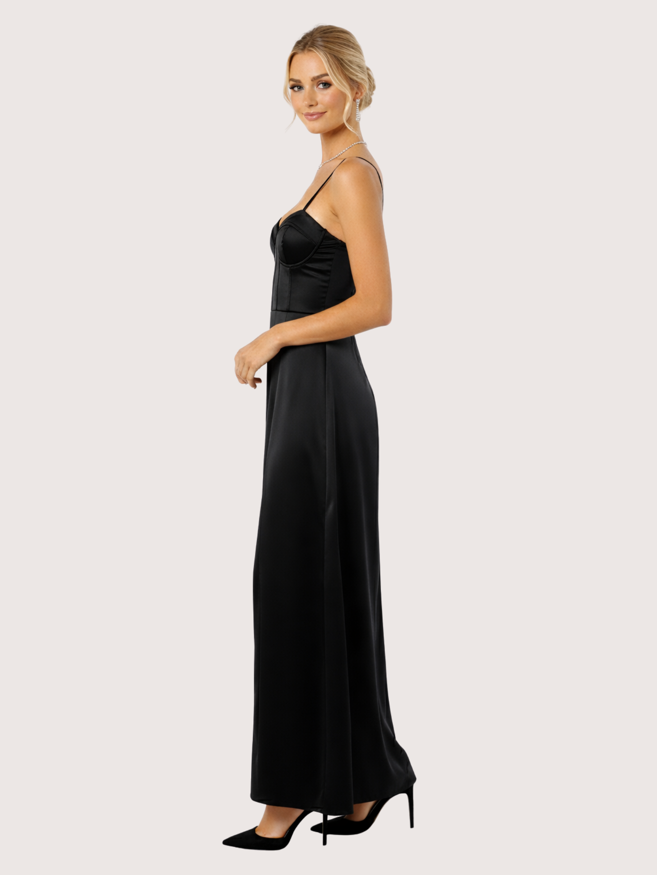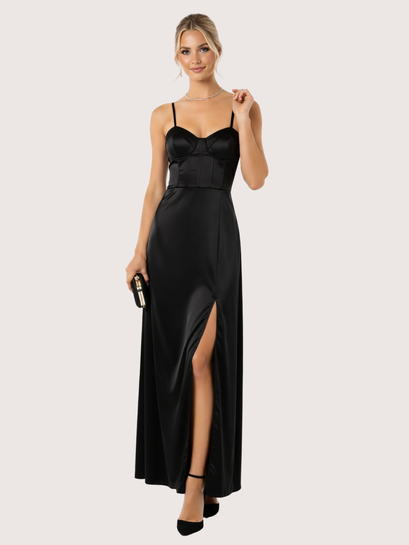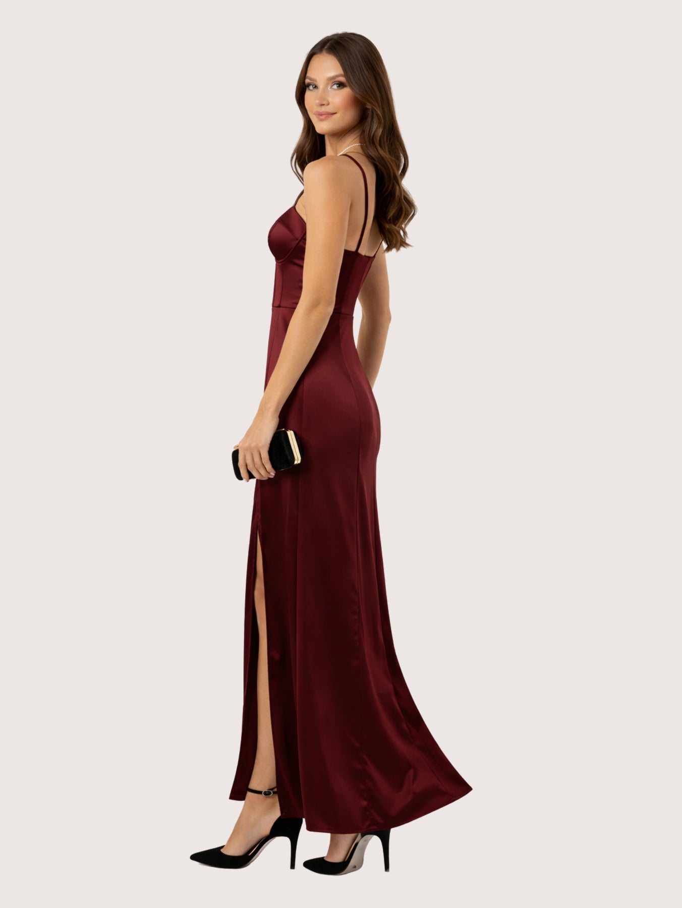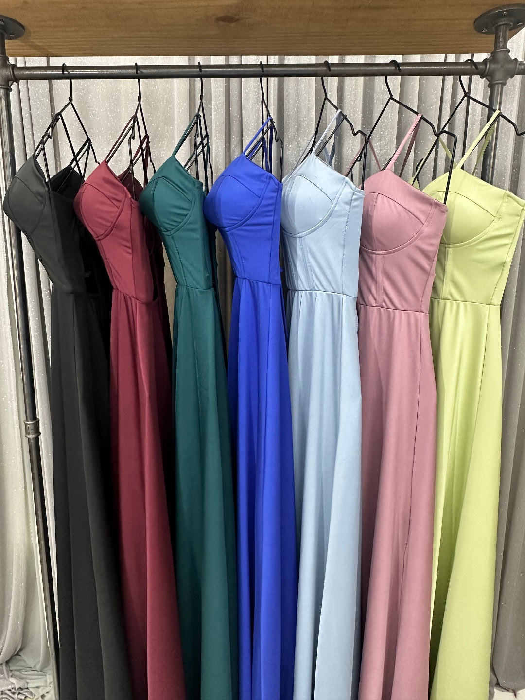 Vestido largo confeccionado en un tejido satinado que aporta un brillo delicado. El vestido presenta en la parte de arriba un estilo corset con escote y la parte de la pollera tiene un tajo o abertura para dar aire y sensualidad. Perfecto para galas, eventos formales o celebraciones especiales, este vestido te hará destacar con un estilo refinado y atemporal. La modelo esta usando Talle 1.