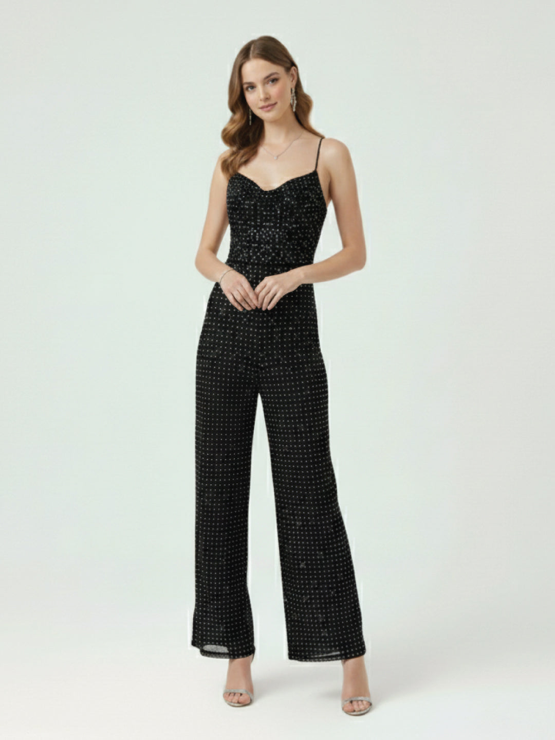 Este mono es una prenda elegante y moderna en color negro, adornado con un patrón uniforme de pequeños apliques brillantes que cubren toda la superficie, creando un efecto sofisticado y llamativo. Tiene tirantes finos que realza el área del busto con delicadeza. El diseño es ajustado en la parte superior, lo que estiliza la figura, mientras que los pantalones de pierna ancha aportan fluidez y movimiento. La combinación de su silueta estilizada y el brillo de los detalles lo convierte en una opción ideal para eventos nocturnos o celebraciones especiales, donde se busca destacar con glamour y estilo.