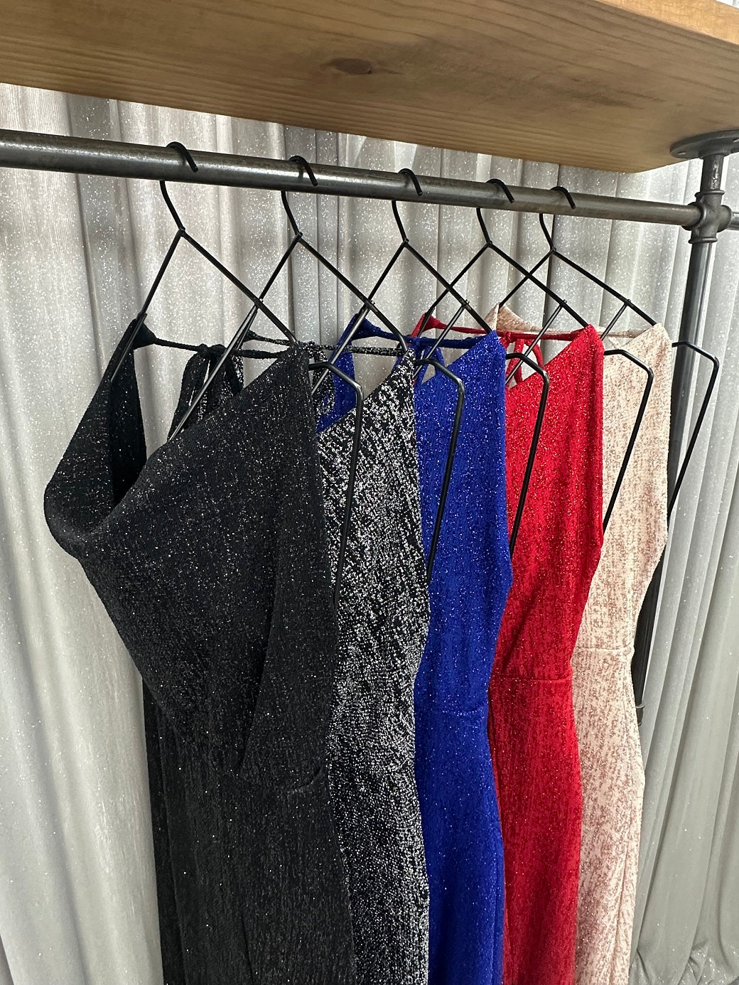 Vestido con tela lurex con efecto de lluvia brilloso, con buche en el busto y espalda descubierta.