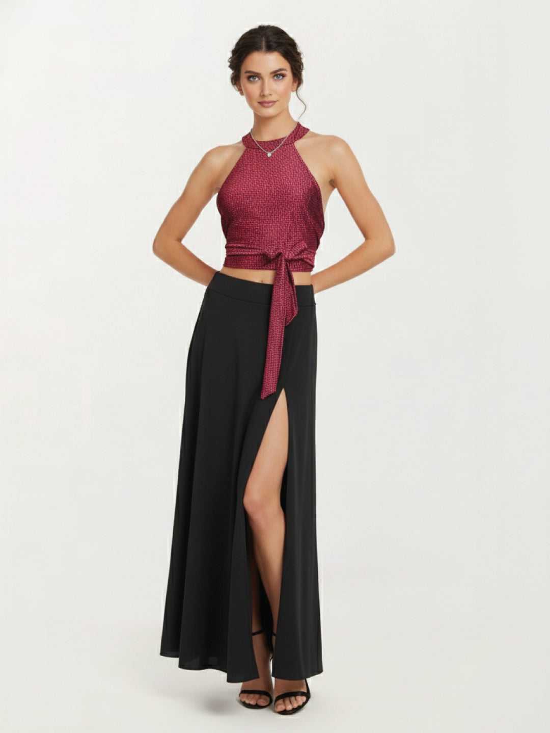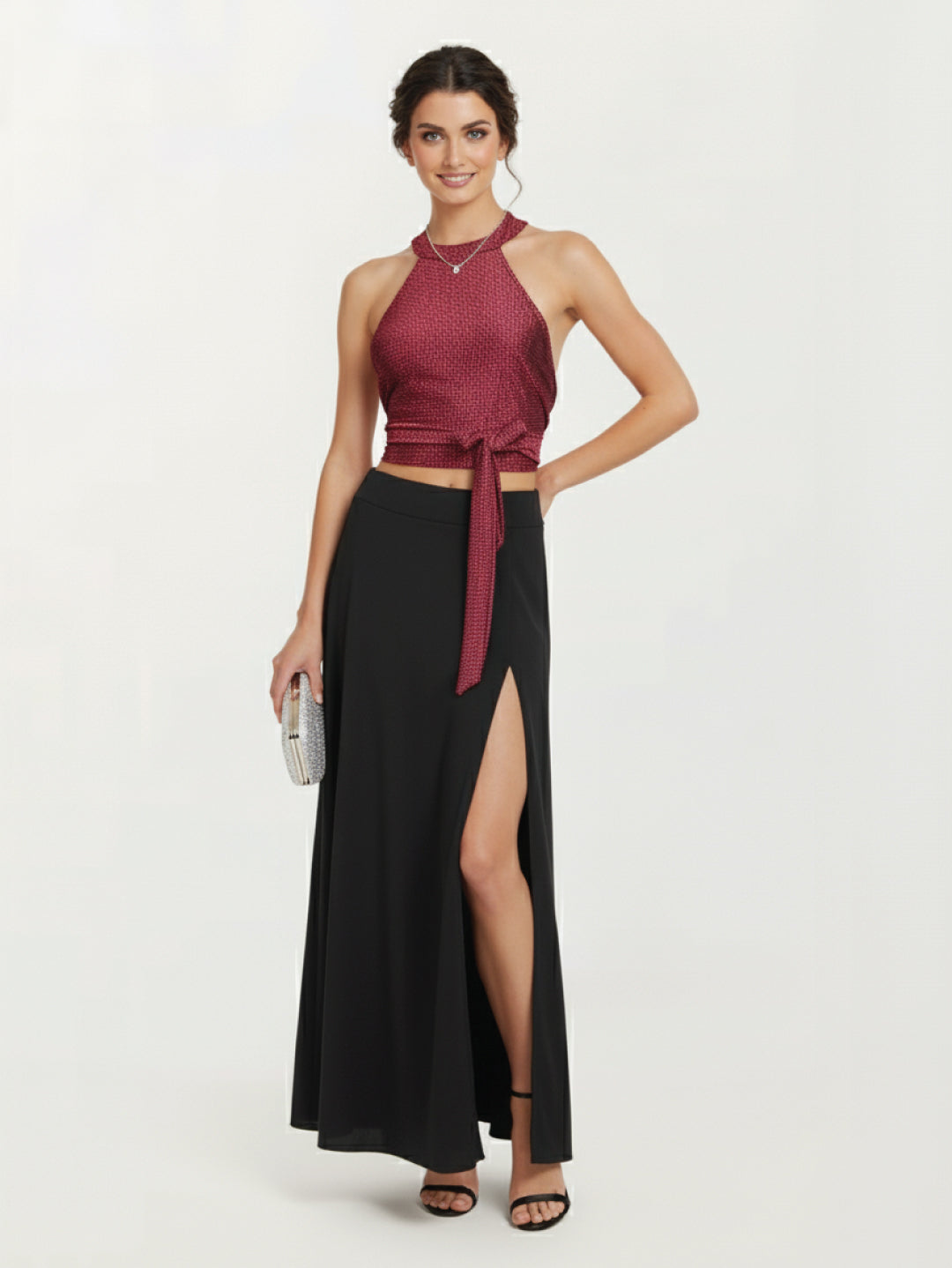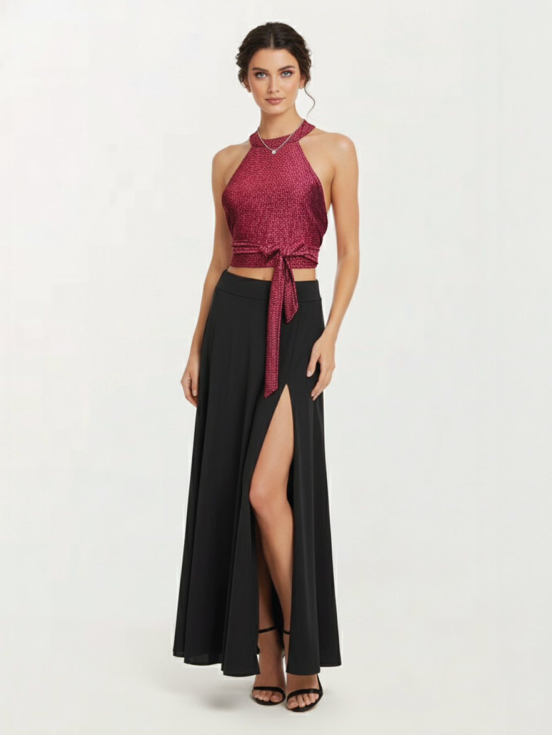 Top halter con acabado brilloso presenta escote favorecedor y un detalle de nudo cruzadoen la cintura. Es la prenda perfecta para destacar en cualquier evento, combinando un toque de elegancia y brillo. La modelo está usando Talle 1.