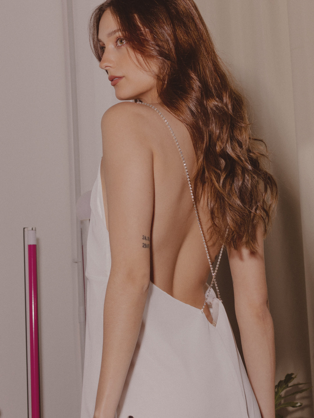 Vestido corto de gasa lisa de excelente calidad con vuelo y una caìda que lo hace aún más fino. La espalda es descubierta con breteles de strass cruzados.