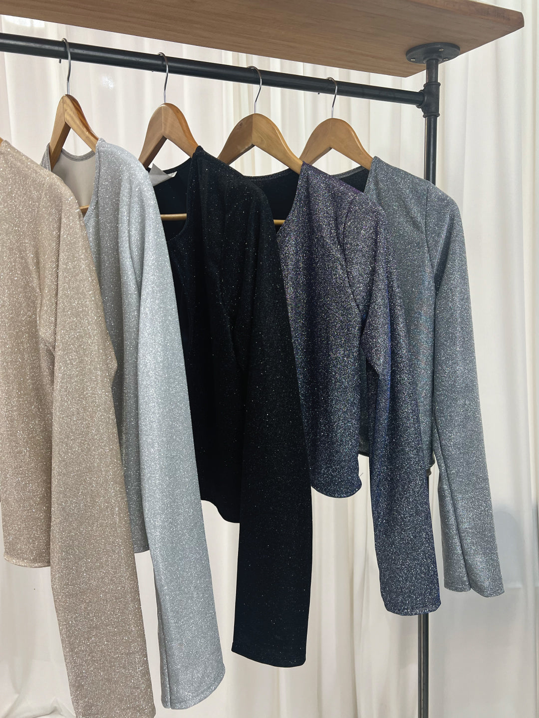 Saco cuello redondo de nuestra tela estrella de tornasol super brillosa. Manga larga con abertura al frente y espalda simple. La modelo está usando un Talle 1 y tiene 95cm de busto.