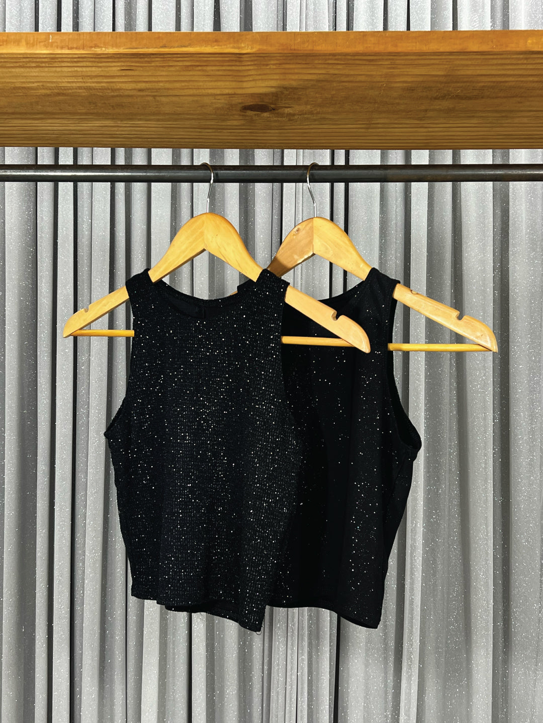 El top presenta un corte cuello cerrado elegante y moderno, ajustándose perfectamente al cuerpo para realzar la figura. Su tejido luce un sutil pero llamativo brillo que añade una textura glamurosa y un aire festivo. El diseño es sin mangas y de cuello redondo, ideal para complementar un look con estilo. La modelo esta usando Talle 1.