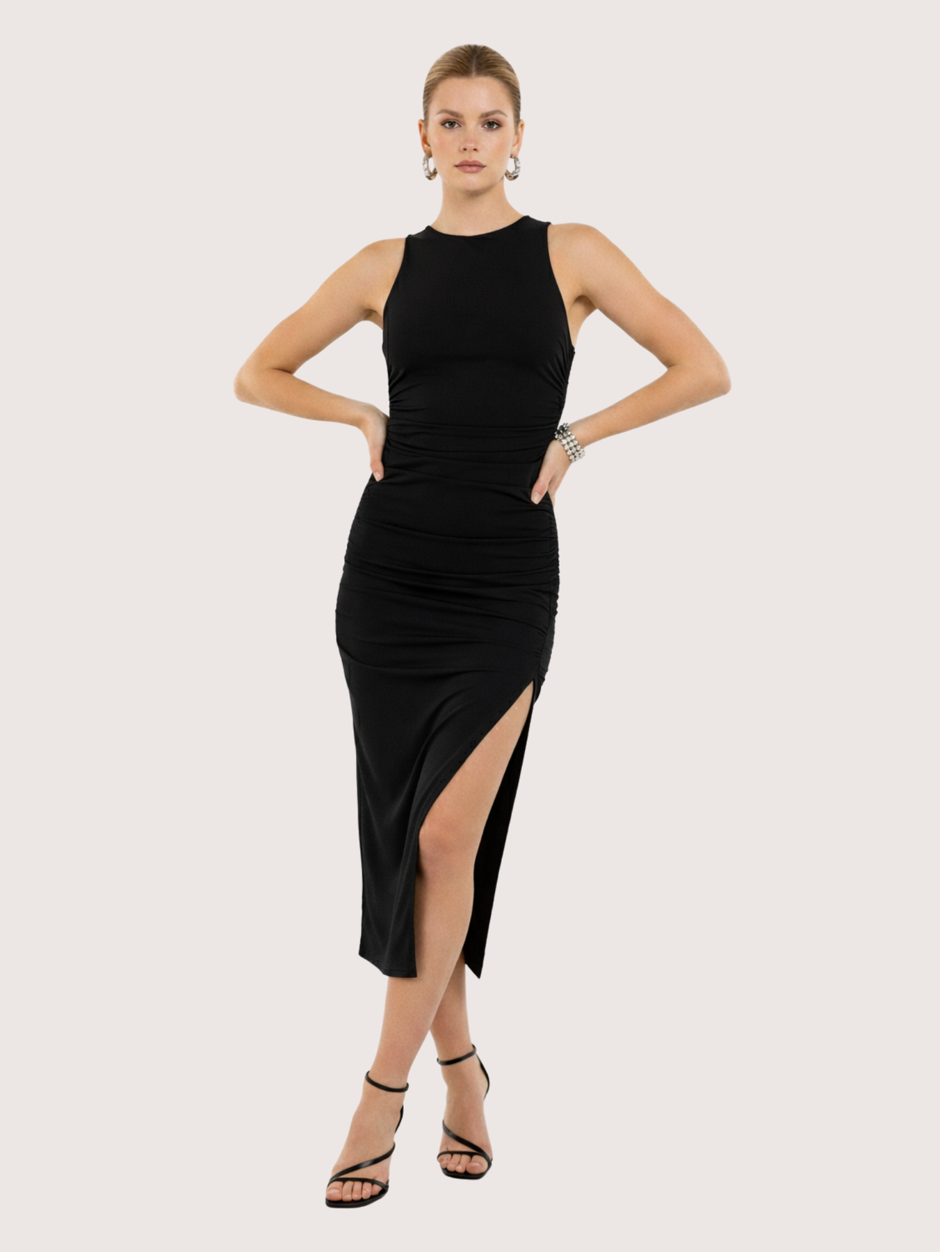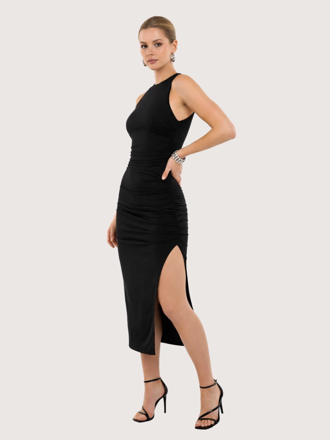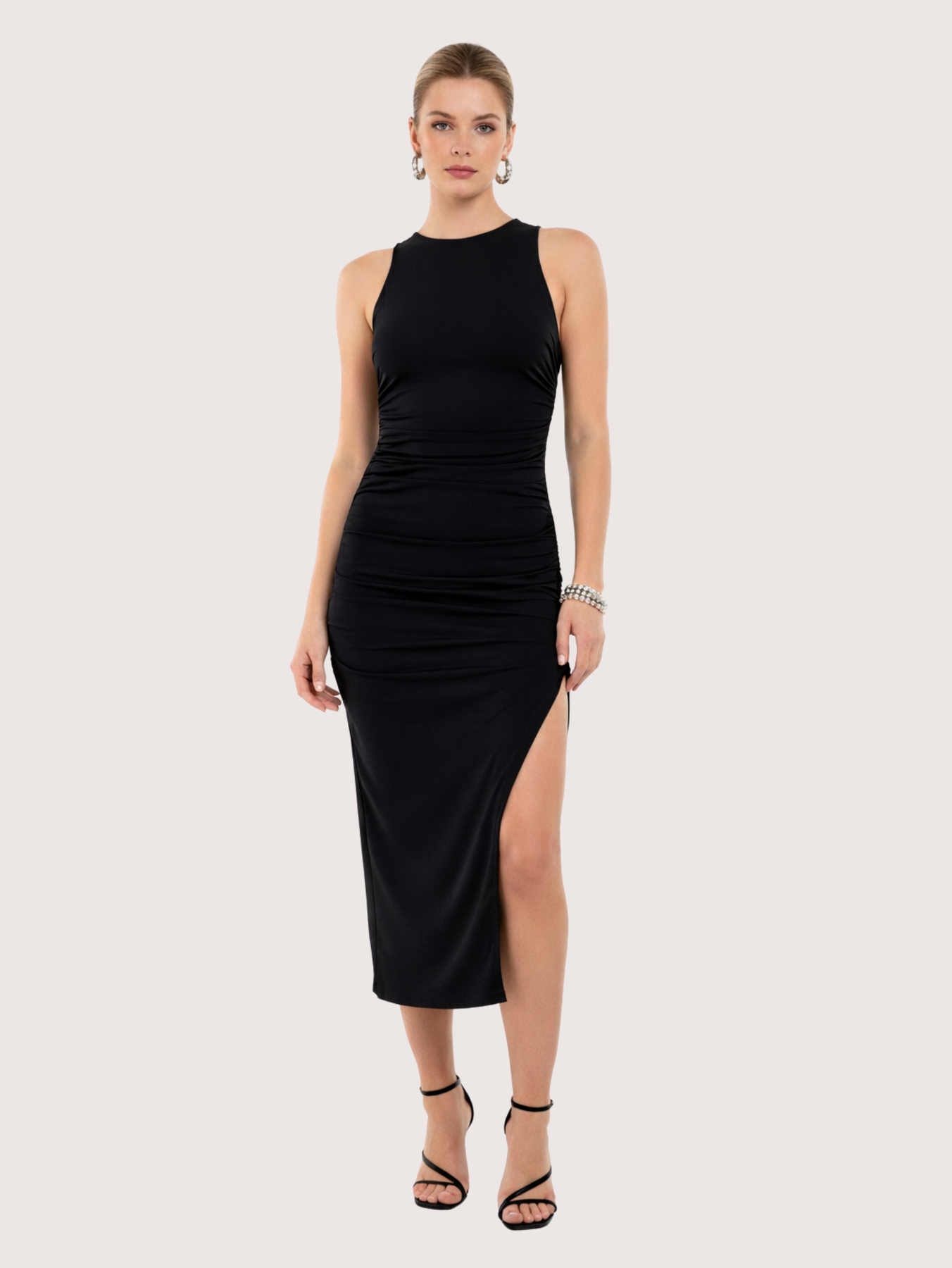 Este es un vestido largo y ajustado con frunces a los costados. Una prenda ideal para lograr un look elegante y moderno. Es perfecto para usar en eventos especiales, salidas nocturnas o cenas formales o incluso en el dia a dia, combinando comodidad con un estilo femenino y actual. La modelo está usando Talle S.