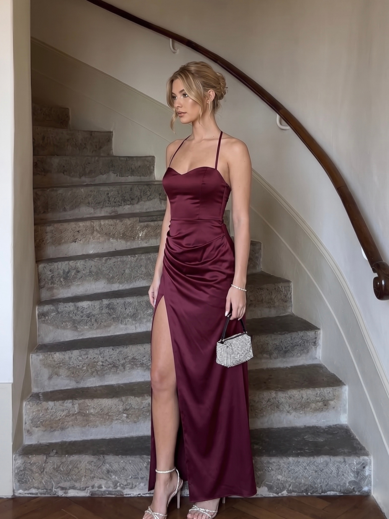 Vestido de tricot strapless con tiras en el cuello para ajustar, tajo amplio y detalle de frunce en el costado. La modelo esta usando Talle 1.
